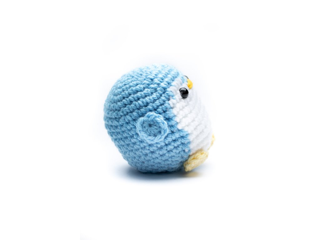 Háčkovaná postavička modrého tučňáka jménem Mrazík.